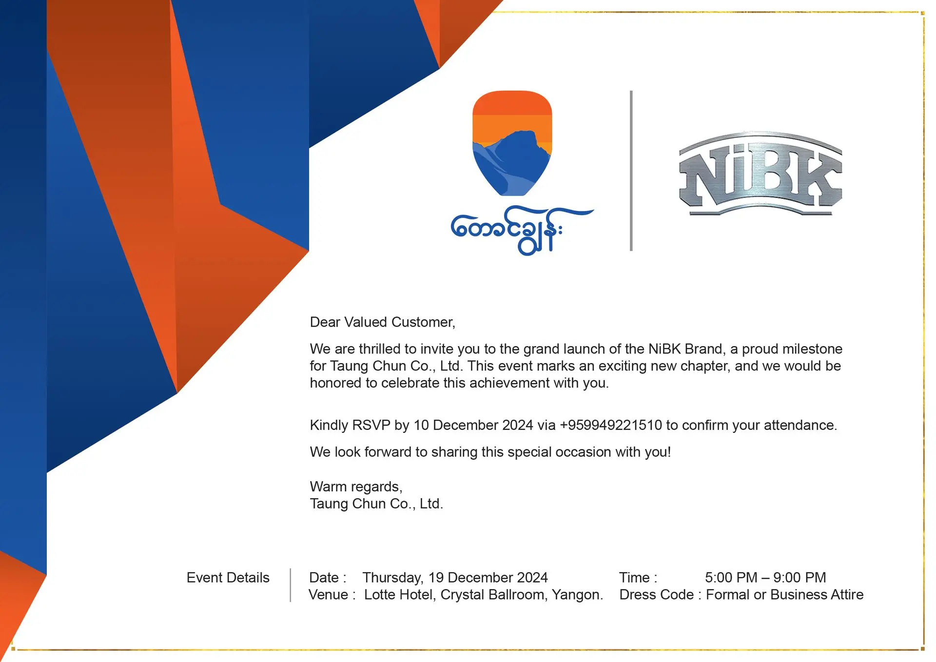 နိုင်ငံပေါင်း ( ၉၀ ) ကျော်မှာ ဖြန့်ချီရောင်းချလျက်ရှိတဲ့ 𝗚𝗹𝗼𝗯𝗮𝗹 𝗕𝗿𝗮𝗻𝗱 ဖြစ်တဲ့ 𝗡𝗶𝗕𝗞 𝗕𝗿𝗮𝗻𝗱 ကို 𝗧𝗮𝘂𝗻𝗴 𝗖𝗵𝘂𝗻 𝗖𝗼.,𝗟𝘁𝗱 မှ မြန်မာနိုင်ငံရဲ့ တစ်ဦးတည်းသော ကိုယ်စားလှယ် အဖြစ် တင်သွင်းရောင်းချသည့် အကြောင်းအား မိတ်ဆက်တဲ့ 𝗢𝗳𝗳𝗶𝗰𝗶𝗮𝗹 𝗣𝗮𝗿𝘁𝗻𝗲𝗿𝘀𝗵𝗶𝗽 𝗔𝗻𝗻𝗼𝘂𝗻𝗰𝗲𝗺𝗲𝗻𝘁 ပွဲကို ဒီဇင်ဘာလ (၁၉) ရက်နေ့က ရန်ကုန်မြို့၊ 𝗟𝗼𝘁𝘁𝗲 𝗛𝗼𝘁𝗲𝗹 တွင် ကျင်းပခဲ့ပါတယ်။